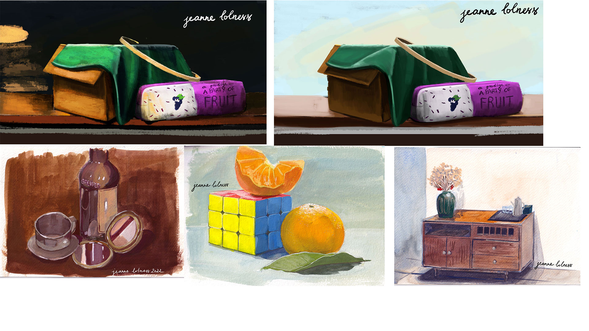 Still life studies are also part of learning about how color and light works. In these studies, I learned about the smallest reaction between different surfaces and objects.