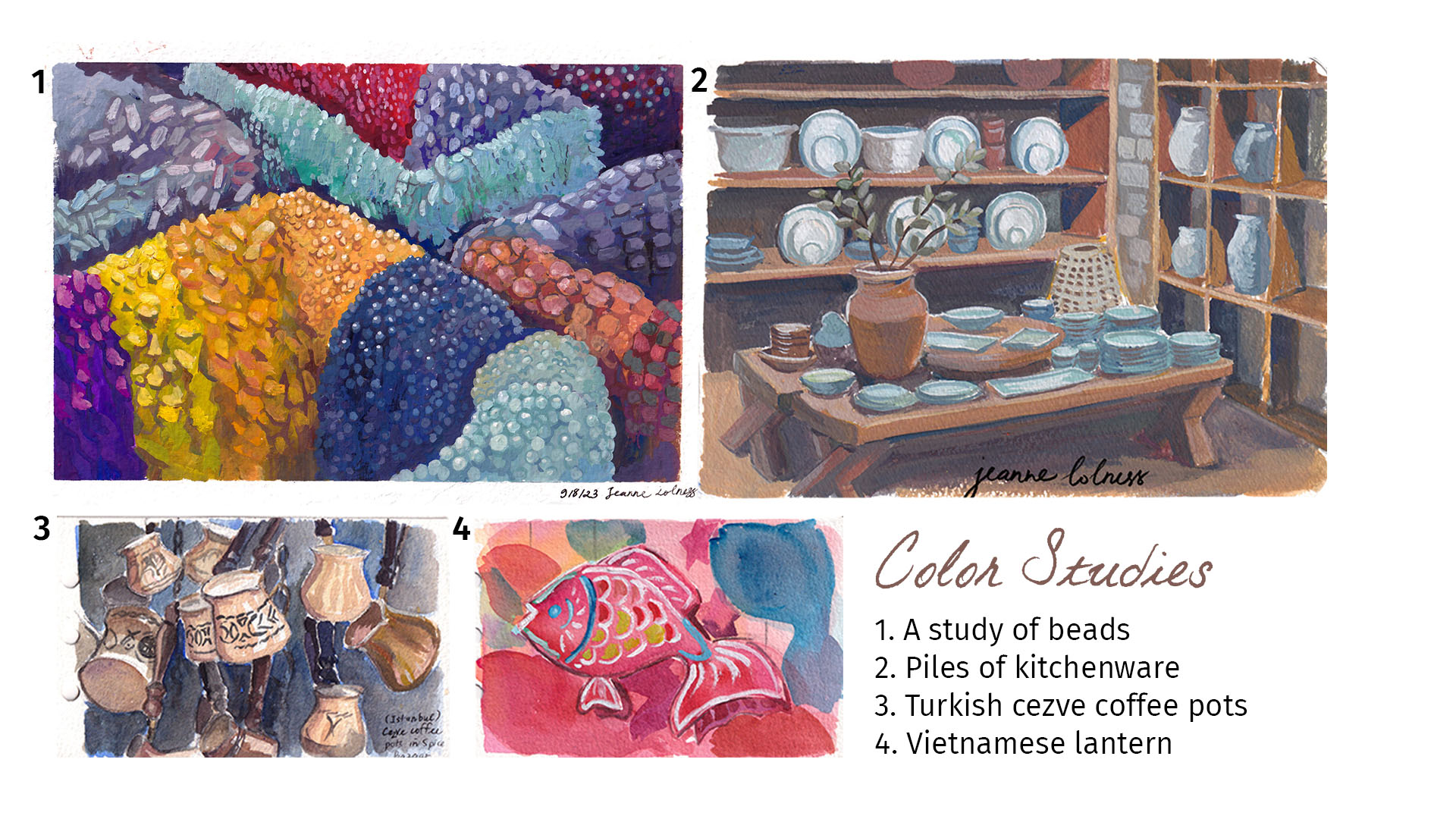 I find it still life studies useful but a bit boring, so I often paint scene with lots of similar objects to practice instead. These objects sitting together show contrast in colors and interesting negative space.