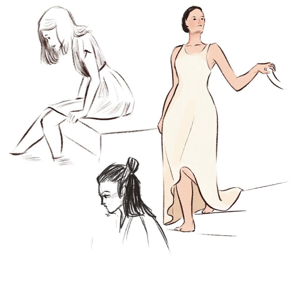Sketching people in drapery is figure sketching but a new level. I practiced figure sketching with nude models or minimal dressed models so when the big challenge is to imagine how their arms and legs move under the fabric. And choosing what folds to tell the story; there will be folds that can be memorized and folds you just add because of a specific pose.
