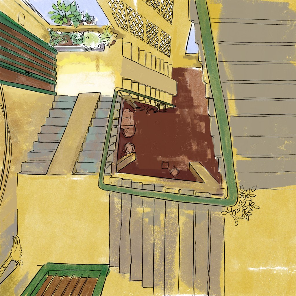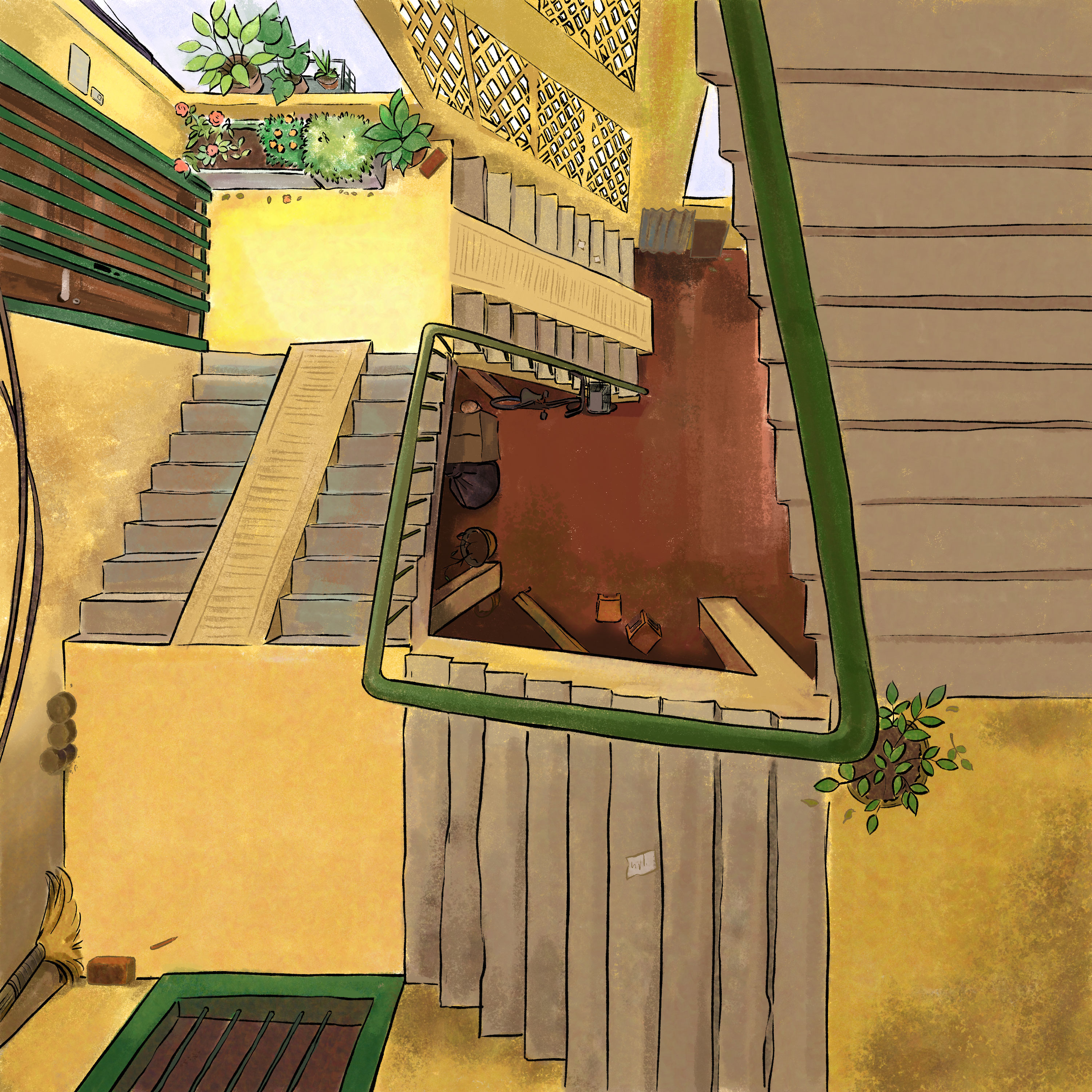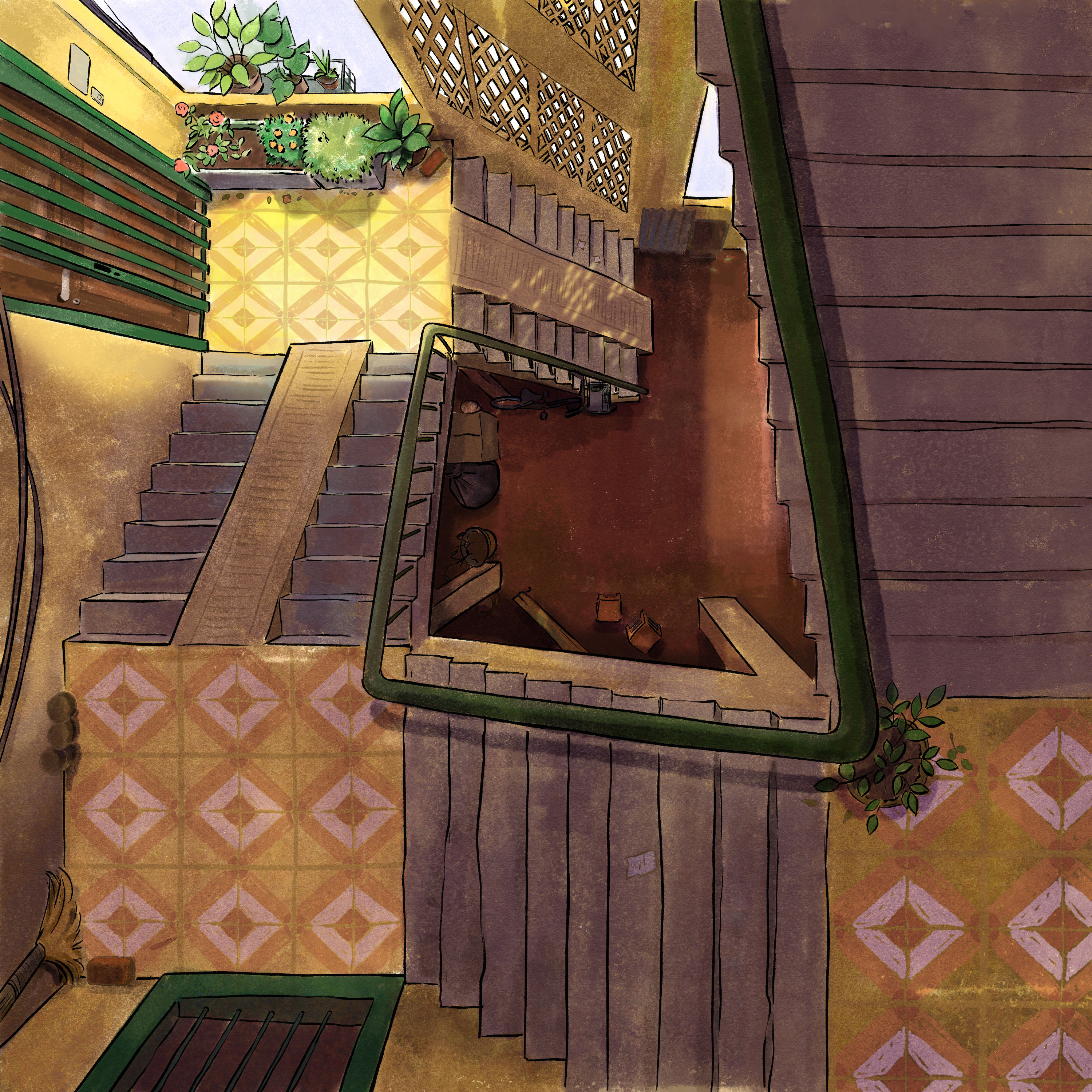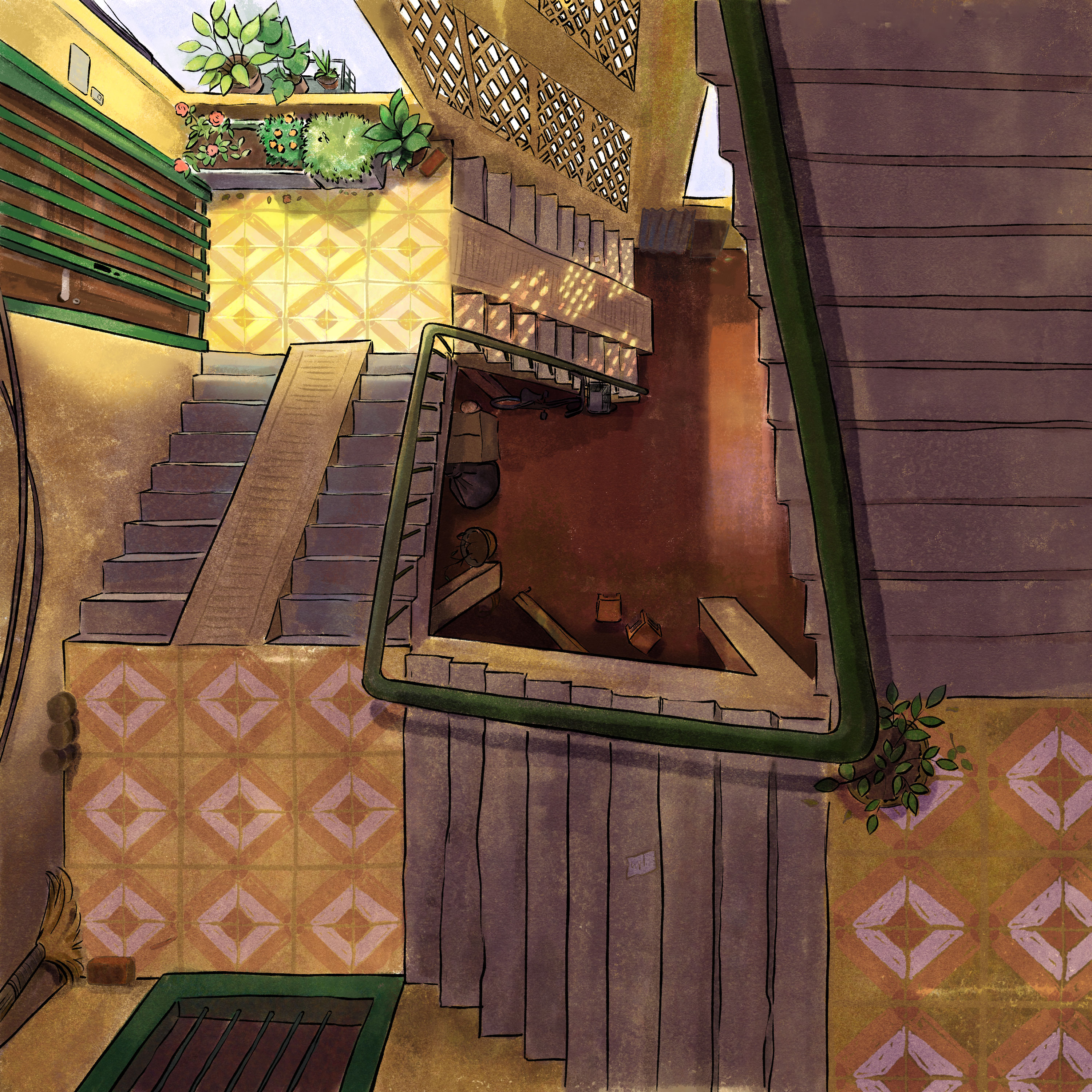 The more challenging stages are about colors: how to pick colors to show that this is not a realistic scene but more of a place in memory? I always know yellow is the main color, so I start with it first.