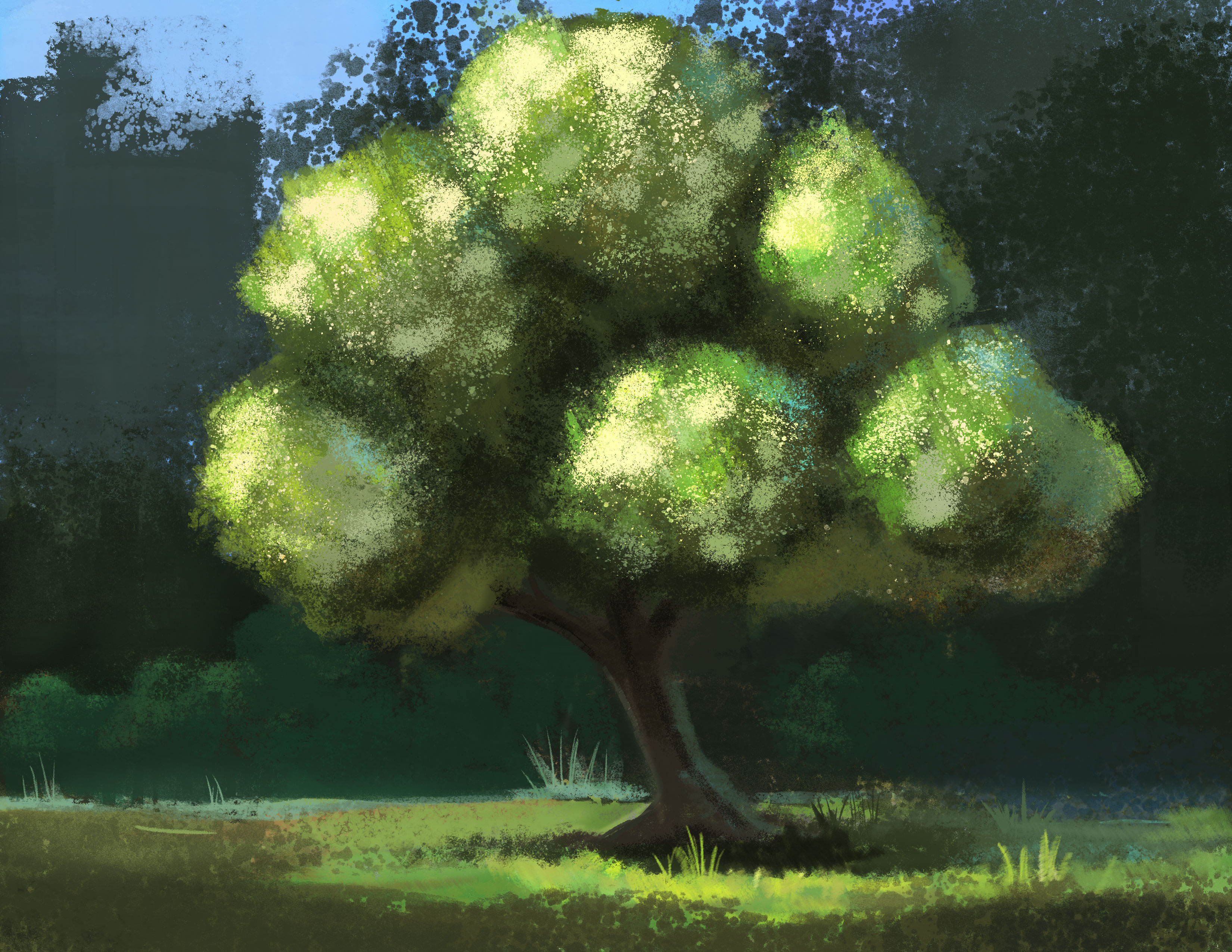 I try to think of the trees as made of multiple balls and add scattered highlights to show the texture of the tree.