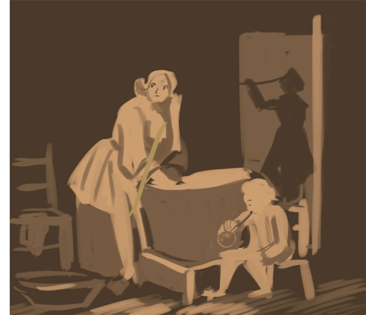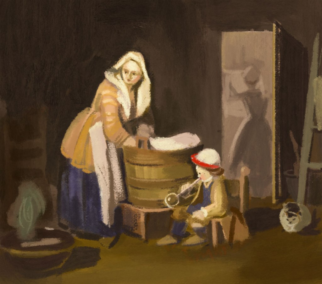 Copying as a warm-up exercise should focus on one purpose only: composition or anatomy or color, etc. These studies can be quickly done in 30 minutes to 1 hour. The exercise is relaxing since the masters has already figured out what and how to paint the focus, lighting setup and color. It’s similar to doing an experiment or research, with all other conditions controlled, focus on one element to understand how to work it out.