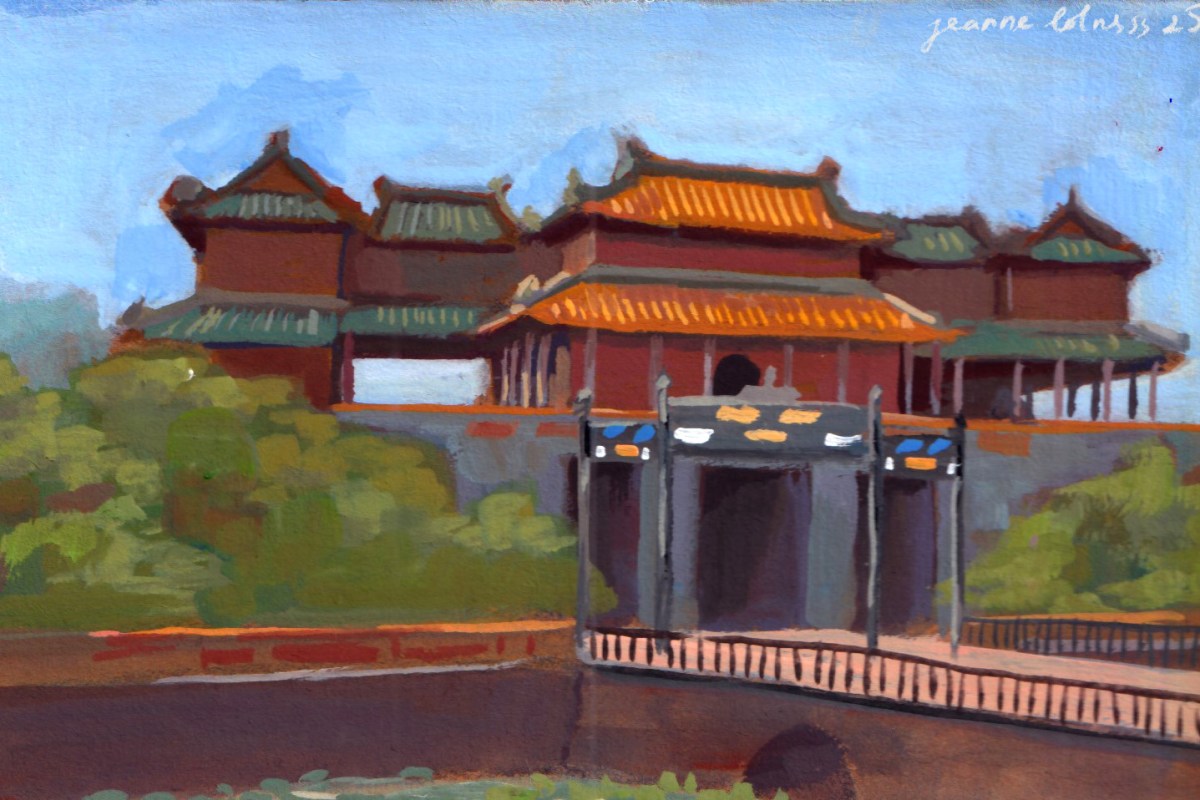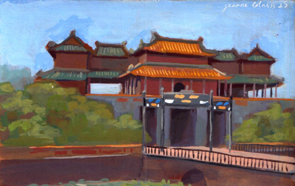 It was a sunny and hot day, and there were swarms of people visiting the citadel: foreigners, local people, Vietnamese travelers. The entrance (Cổng Ngọ Môn) was the most crowded spot, afterwards, people started wandering to different areas. It was understandable, because the entrance was built to impress anyone coming, foreshadowing normal people to pay respect to the king. My little painting can’t capture all the details of the entrance, many decorative elements were made by skilled craftsmen from all across Vietnam.