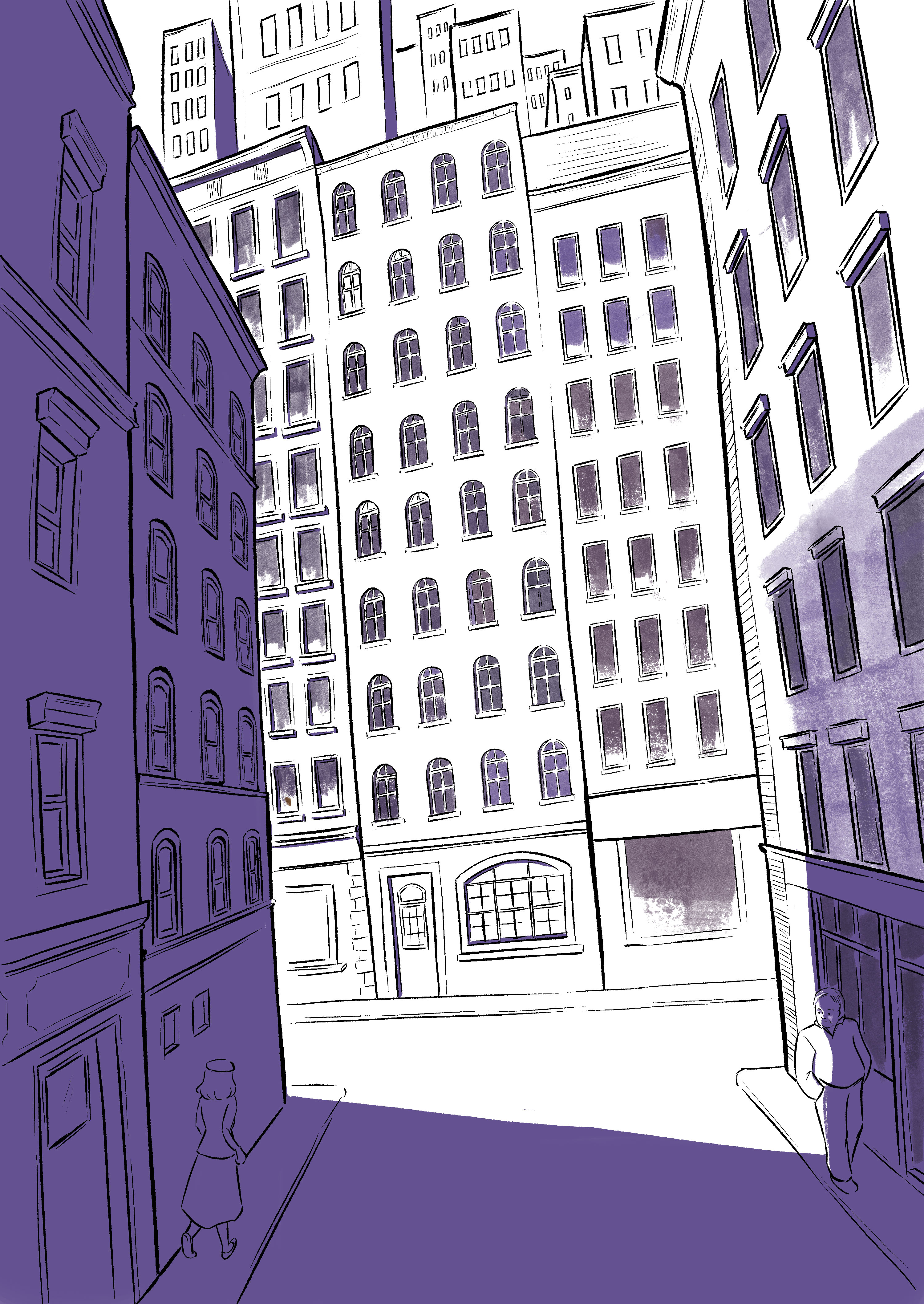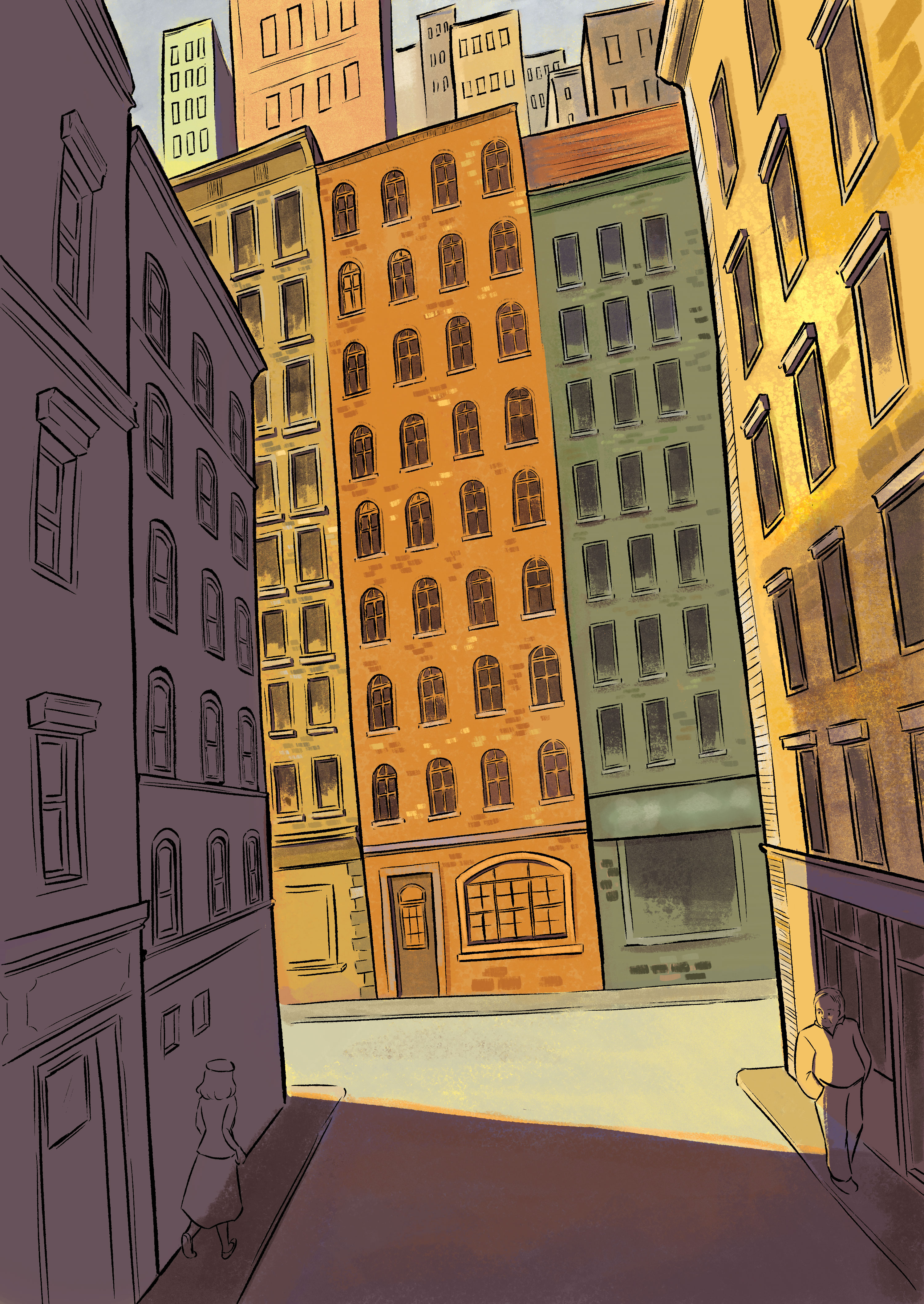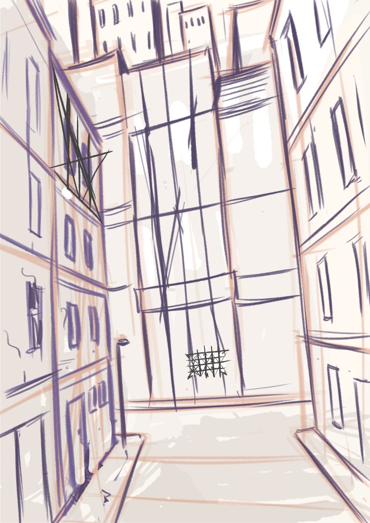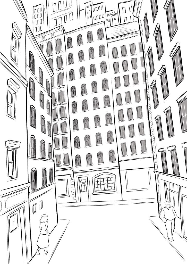 The sketching for this illustration actually took longer than the painting. There are a lot of windows to draw and I have to make sure the perspectives are distorted out of reality. About color, I already have the idea of using orange-yellow tone for a nostalgia vibe, which indirectly determined my choice of shadow (purple).