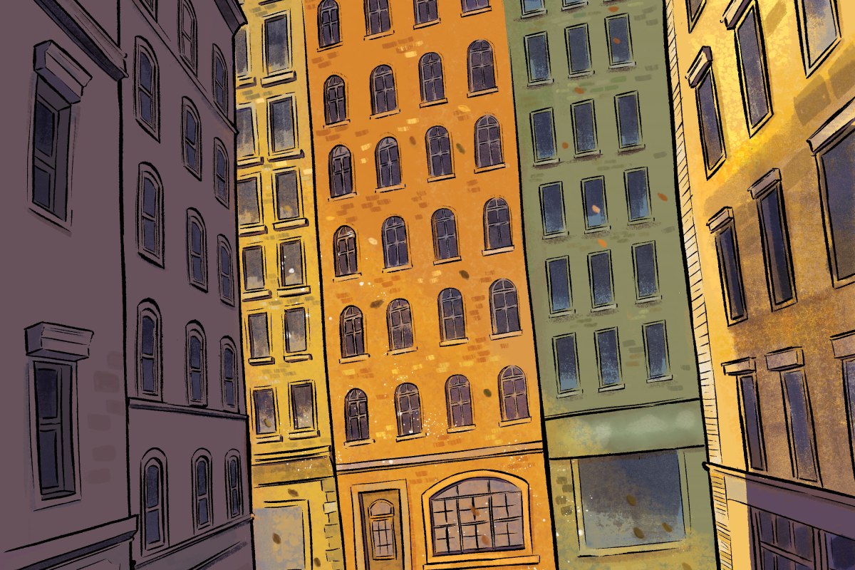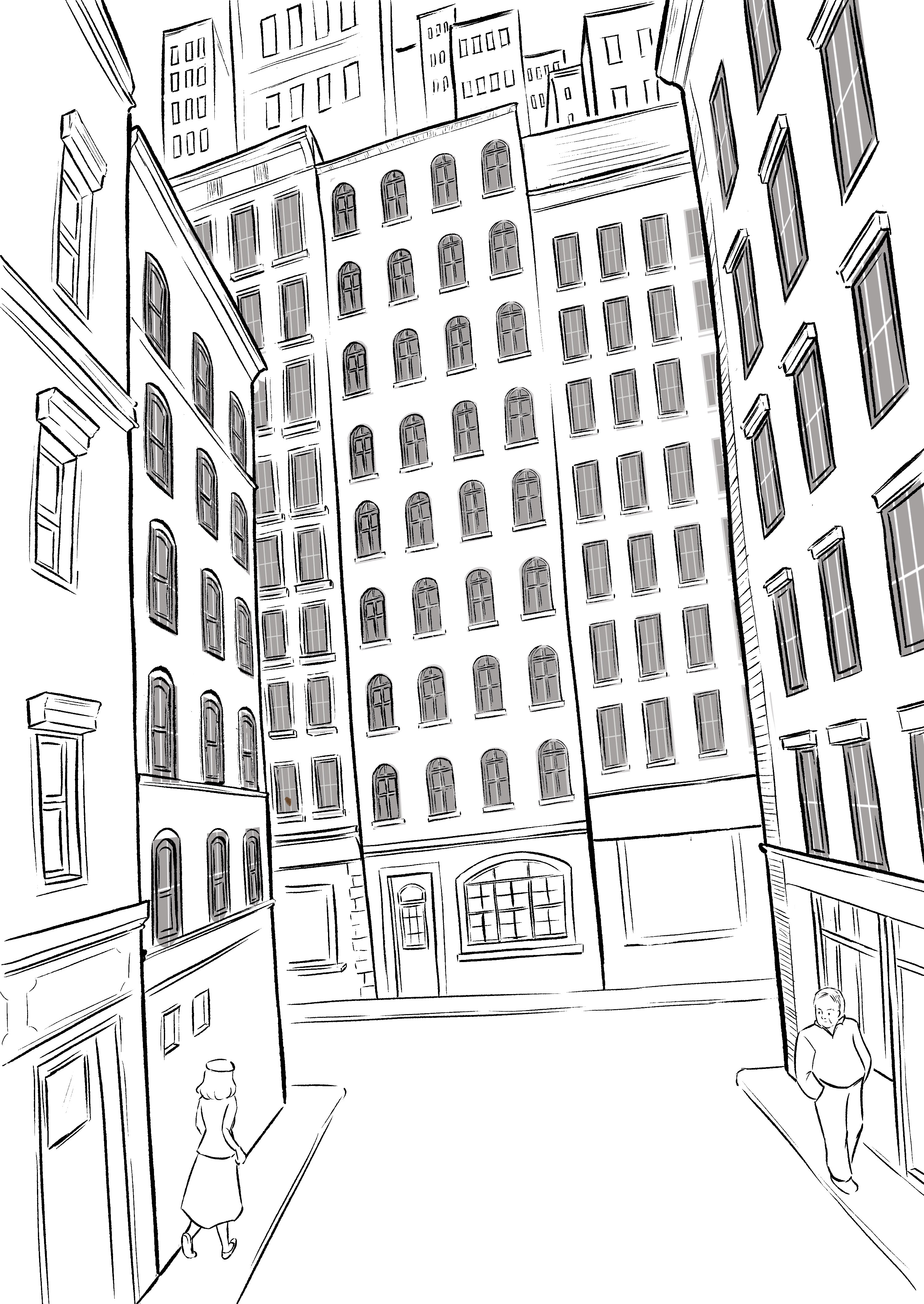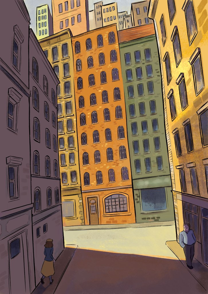 The sketching for this illustration actually took longer than the painting. There are a lot of windows to draw and I have to make sure the perspectives are distorted out of reality. About color, I already have the idea of using orange-yellow tone for a nostalgia vibe, which indirectly determined my choice of shadow (purple).
